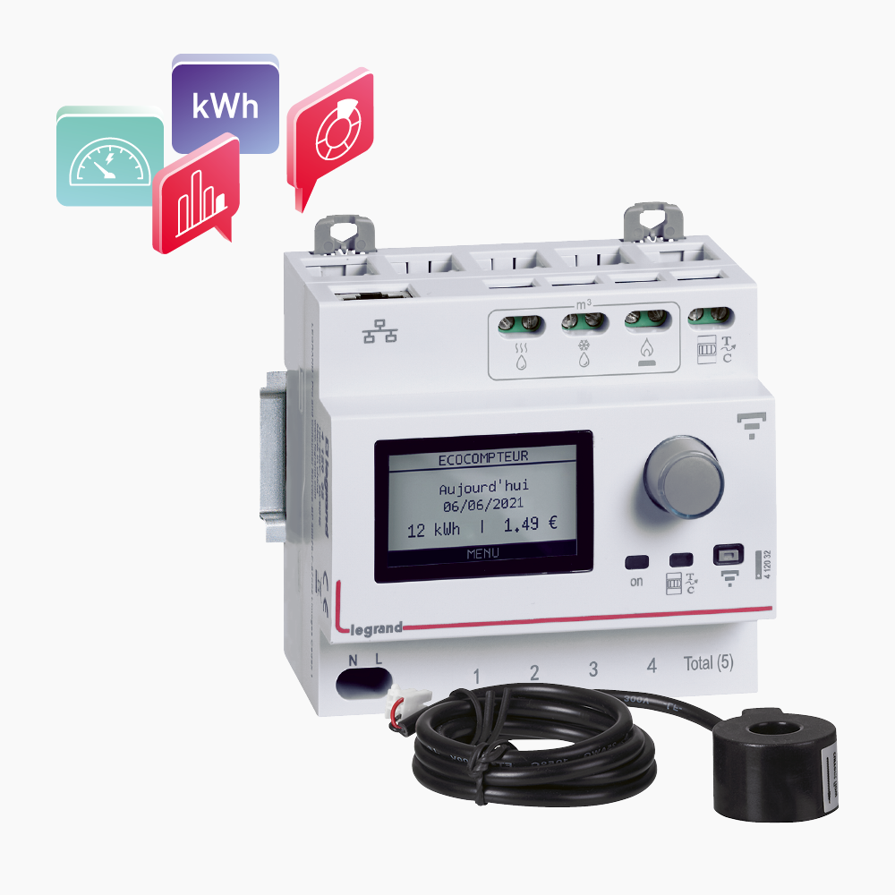 - Messen des Gesamtstromverbrauchs 1-phasig, für das Gebäude und den Teilverbrauch in 5 spezifischen Bereichen wie